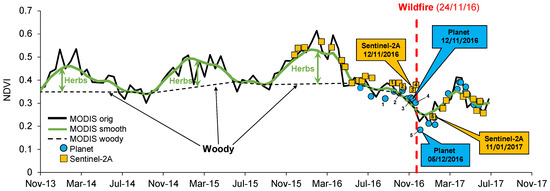 Figure 2 shows the seasonal growth cycle of the vegetation in the MODIS-NDVI time series. The minimum value at the beginning of the season corresponds to the signal coming from the trees (evergreen woody vegetation), while the seasonal signal of NDVI corresponds mainly to the ephemeral herbaceous vegetation growth and senescence. The fire of November 2016 is evident in the NDVI time series as a sharp decrease clearly seen from the NDVI time series derived from the three satellites (Figure 2).
