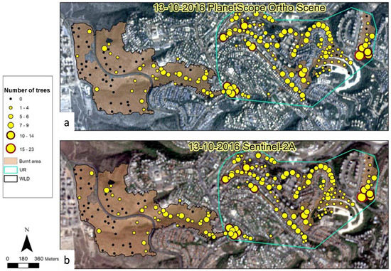 Number of trees counted in each (10 m × 10 m) plot in the WUI of Haifa as derived from field survey. Circle size is proportional to the number of trees in the plot. Plots are shown over false color RGB of (a) Planet Scope Ortho scene and an (b) Sentinel-2A image. Both images were taken prior the November 2016 fire (13 October 2016).