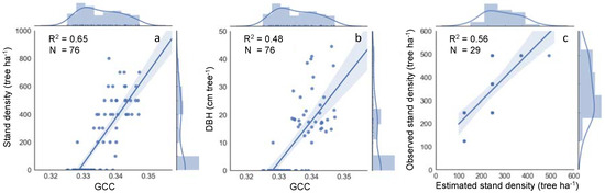 Figure 4 shows a scatterplot of GCC vs field measurements of stand density and DBH for Planet (image acquired in 23 August 2016). The GCC calibrated stand density linear regression equation was successfully validated with the stand count conducted in an area nearby the WUI, with R2 = 0.56 (Figure 4c).