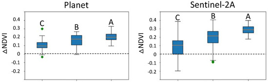 All images went through radiometric and sensor corrections and were orthorectified to a cartographic projection. Sentinel-2A images were atmospherically corrected using the Sen2Cor algorithm [36]. Vegetation indices were calculated from the spectral bands for Planet and Sentinel-2A (Section 3.2).