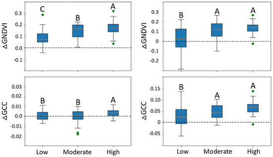 Boxplots of VI in areas classified in field as low, moderate and highly burned. GNVI, NDVI, and GCC were derived from Planet and Sentinel-2A images. Different letters signify statistically different means (p < 0.05) using one-way ANOVA followed by Tuckey HSD separation procedure.