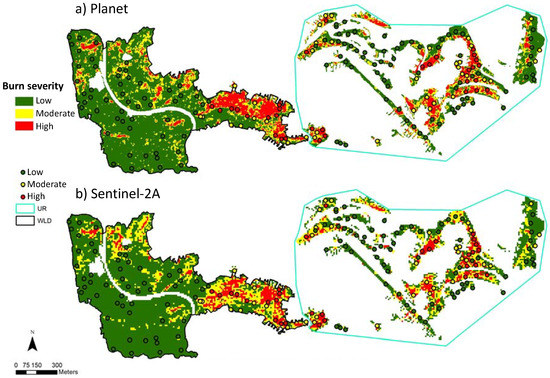 Burn severity maps derived from ΔNDVI using (a) 3 m Planet and (b) 10 m Sentinel-2A images. The plot-based classification of the burn severity levels is also shown (circles).