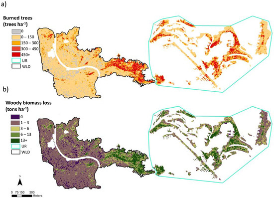 The number of trees that were consumed by the fire (or which died following the fire) were calculated from the satellite-derived stand density and burn severity maps. Following in-field observations and observations reported by Meigs et al. 2009 [57], we applied assigned values of 22%, 54%, and 98% burned trees to areas that experienced low, moderate, and high burn severity, respectively. Average values of 10%, 25%, and 40% were applied on the AGB map to derive the woody biomass consumed by the fire in low, moderate, and high severity burned areas, respectively [57]. Higher values were reported in Mediterranean environments of 25%, 47%, and 65% [58], and 32%, 52%, and 85% [59] for low, moderate, and high burn severities. These values are generally within the range provided by Meigs et al. 2009 [57]. Nevertheless, we decided to use here the aforementioned averaged values provided by Meigs et al. 2009 [57], which give a more moderate and realistic estimation compared to the qualitative assessment which was undertaken during the field survey in our study area.