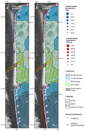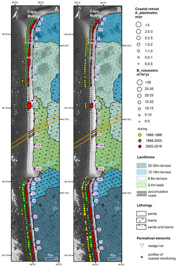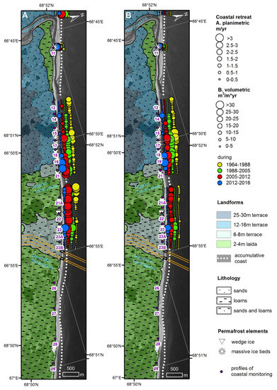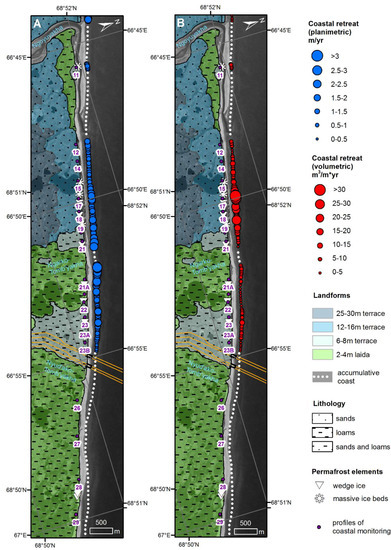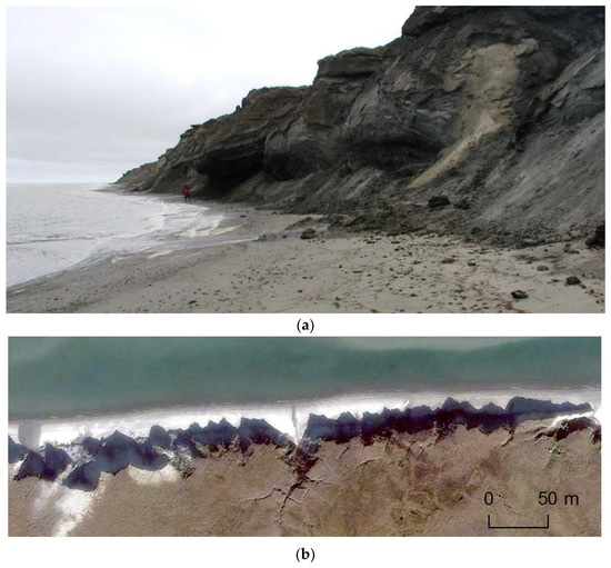 Permafrost coasts make up to 34% of the world’s coastlines and retreat with an average rate of 0.5 m/yr [1]. Dynamics of Arctic coasts composed of frozen unlithified sediments have a strong influence on terrestrial [2,3], marine [4,5], and atmospheric [6] systems. In recent decades, coastal erosion accelerated in most of the polar regions due to rapid climate change, with its impact on the Arctic two times larger than on the rest of the world [7,8]. The decline of sea ice extent [9,10], storm frequency increase [11,12], thermal and wave action growth [13], and sea-level rise [14] have a dramatic impact on the arctic coastal dynamics [15,16,17,18,19,20].