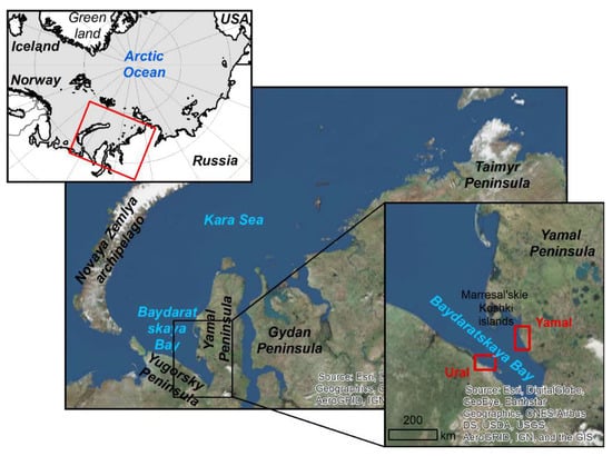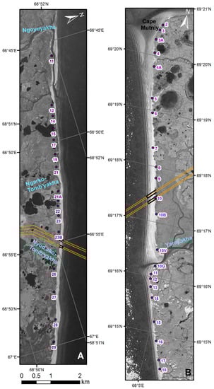 The Kara Sea is located in the western part of the Eurasian Arctic ocean shelf (Figure 2). Two key sites of the study are located in the western part of the Kara Sea on the western (Ural) and the eastern (Yamal) coasts of Baydaratskaya Bay (Figure 2). The Ural key area is an 11 km long coastal segment between the mouth of the Ngoyuyakha River in the west, and the laida (low surface inundated during the highest tides and storm surges) on the eastern side of the Nyudyako-Tambyaha River in the east (Figure 3). The Yamal key area is a 12.5 km long coastal segment between Cape Mutniy in the north and the ravine 4 km north of the Liyaha River’s mouth in the south (Figure 3).
