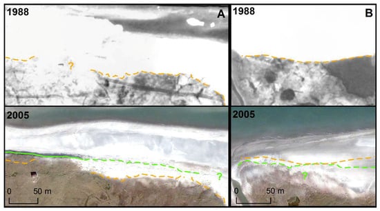 We traced the coastline along the top of the cliff at erosional sections and along the dense vegetation boundary (upper limit of high waves action) at accumulative sections. In some cases, tracing the coastline on aerospace images, and even in the field, was challenging and argued. For instance, in the study areas the cliff-top of the low-lying coastal plains was often buried by aeolian sands (Figure 4A) or the dense vegetation boundary was unclear and gradual (Figure 4B). Tracing the shoreline at such sectors was especially complicated, often impossible, on the bleached analogue aerial or Corona images of lower resolution. On the large sectors of pipeline and other infrastructure construction, the shoreline was substantially disturbed.