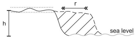 Schematic transect across the cliff. The eroded area (dashed) is a product of cliff height (h) and linear retreat (r). The accuracy of this value relies on the uncertainty of retreat and variations of the eroded surface height assumed to be similar to variations of the modern surface height.