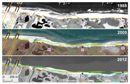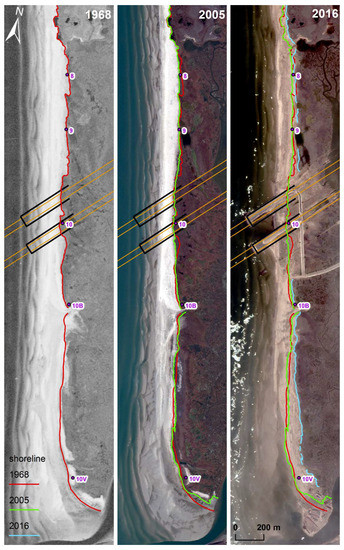 - Thieler, E.R.; Himmelstoss, E.A.; Zichichi, J.L.; Ergul, A. Digital Shoreline Analysis System (DSAS) version 4.0. An ArcGIS Extension for Calculating Shoreline Change. U.S. Geological Survey Open-File Report 2008-1278. 2009. Available online: https://pubs.er.usgs.gov/publication/ofr20081278 (accessed on 5 March 2018).