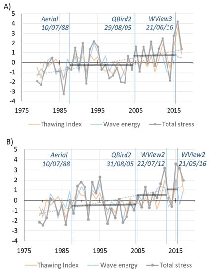 Our results showed a general increase of coastal erosion rates from the 1960s to 2012. This agrees well with estimations of the total hydrometeorological stress on our sites (Figure 12) and for the Barents-Kara region in general [73]. The peak erosion rate values typical for 2005–2012 coincided with high hydrometeorological stress [73]. Still, the subsistent high total stress in 2013–2015 did not result in high retreat rates in this period. The reason is that total stress was low during two previous years. For the 12–16 m terrace this led to a temporary stop in erosion. The energy of the storms of 2015 was spent on the removal of material that had come to the beach in previous years. The thermal factor could also begin to work only after the removal of the thawed sediment by waves. Therefore, despite the high total stress in 2015, the retreat rates for this period in comparison with the rates of 1988–2005 were the same for high terraces and for the 2–4 m laida. That is to say, the higher the shore is, the less resistant it is to changes in hydrometeorological forcing. The rates of retreat of higher shores in a particular year are determined not only by the situation of this year, but also by the combination of wave energy and the thermal factor in previous years.