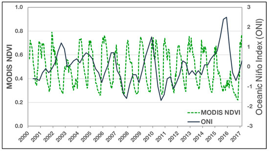 Moderate-Resolution Imaging Spectroradiometer (MODIS)-normalized difference vegetation index (NDVI) time series of the area (10 km × 10 km) around the Skukuza flux tower (25°1.184′S, 31°29.813′E) and the oceanic Niño index (ONI) [11,12]. Note the significant decrease in NDVI during the meteorological drought of 2015/2016 in combination with the occurrence of an extreme El Niño event.