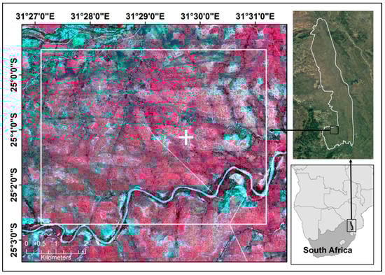 Location of the study area (ca. 50 km²) in the southern Kruger National Park (KNP) (Skukuza eddy covariance flux tower and in situ soil moisture probes, white cross) (Imagery source: Copernicus Sentinel-2A data 19 January 2017 (R: Band 8; G: Band 4; B: Band 3)/Google Earth/FAO Country Shape).
