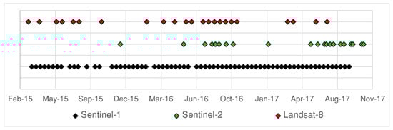 Although Sentinel-2 images are covering the study area, cloud free acquisitions were only available after the 26 November 2015. Thus, we incorporated satellite information from Landsat-8 (Path 168/Row 77) in order to increase the data availability of optical satellite information for this study. We identified 23 Landsat-8 scenes in total, covering the period between 10 March 2015 and 5 July 2017 (Figure 3). This enables the expansion of the time series, as well as shortening the time interval in combination with Sentinel-2.