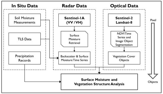 Methodological framework for the retrieval of a surface moisture index from radar time series, as well as vegetation information and dynamics from optical earth observation data.