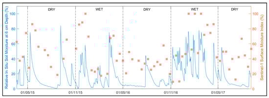 Relative in situ soil moisture information (blue line) and Sentinel-1-derived SurfMI (red dots) time series for the dry (May to October) and wet (November to April) seasons between 2015 and 2017.