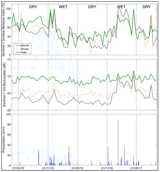 Figure 7 shows the time series of the Sentinel-1-derived SurfMI for the three different land cover classes, Sentinel-1 cross-polarized (vertical-horizontal—VH) backscatter, which represents the volumetric scattering component of the signal (vegetation structure), as well as precipitation records for this area, which are combined from two stations within the study area.