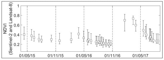 To analyze the impact of the drought on vegetation greenness, NDVI time series information from Sentinel-2 and Landsat-8 was utilized. Figure 8 shows the combined NDVI time series derived from cloud-free Sentinel-2 and Landsat-8 scenes available for the entire study area within the observed period. Note, that the first Sentinel-2 cloud-free image for this region was available on 26 November 2015. The data coverage during the wet seasons of 2015/2016 and 2016/2017 is limited due to cloud coverage during the rainy season.