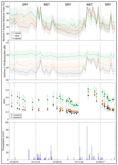A slight decrease in both the Sentinel-1-derived SurfMI and the NDVI time series are clearly visible during the wet season of 2015 for all three classes. At the same time, the Sentinel-1 VH backscatter is stable with some exceptions due to small precipitation events towards the end of the season. The wet season from 2015/2016, i.e., the onset of the extraordinary drought, is showing two significant increases in the SurfMI for all classes, which is potentially caused by small precipitation events at the beginning of the wet seasons. The Sentinel-1 VH backscatter time series also shows similar dynamics for the land cover classes “open” and “sparse vegetation”. However, the class “closed vegetation” is showing almost no changes in the volumetric scattering processes. As the wet season 2015/2016 was characterized by low amounts of rainfall, it exhibits relatively stable conditions for the NDVI signal describing the vegetation greenness and vitality. The dry season of 2016 featured an additional decline in the SurfMI. Especially the class “sparse vegetation”, which is including the majority of bare soil areas, is influenced by these exceptionally dry conditions. The NDVI time series has a very dense temporal resolution as the cloud cover during this period is quite limited. All land cover classes are showing a decreasing NDVI trend. In this time, the decrease in the classes “open” and “sparse vegetation” had the largest decline in NDVI from the end of the wet season. In addition, the SurfMI derived from Sentinel-1 shows a larger impact of drought on low and medium vegetation cover than on closed vegetation cover, dominated by trees [68]. After the extremely dry period from 2015 to 2016, the wet season of 2016/2017 is characterized by a strong precipitation events right at the beginning of the period (refer to Section 4.2). This results in a strong increase in the SurfMI during the entire season. When analyzing the SurfMI, as well as the Sentinel-1 VH backscatter time series, this effect tends to be higher for the land cover classes “open” and “sparse vegetation”. After the strong precipitation events, the NDVI values are showing a strong increase for all land cover classes. Unfortunately, no NDVI information was available for the beginning of this particular wet season of 2016/2017, which would potentially allow for a better description of the NDVI time series dynamics. The following dry season experienced almost no significant rain events, which is also clearly visible in the SurfMI and NDVI time series for all observed land cover classes. However, small precipitation events at the beginning of the dry season seem to have a larger impact on the class “sparse vegetation” than on “closed” and “open” vegetation cover types.