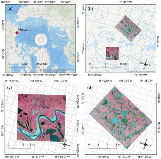 Geographical setting of two study areas. The areas are located near the town of Nuiqsut, Northern Alaska (a) with the ‘Nuiqsut’ scene including the community of Nuiqsut near the Colville River and to the west is the scene ‘Crea Creek’ (b–d). The candidate aerial images scenes are presented in false color composites.