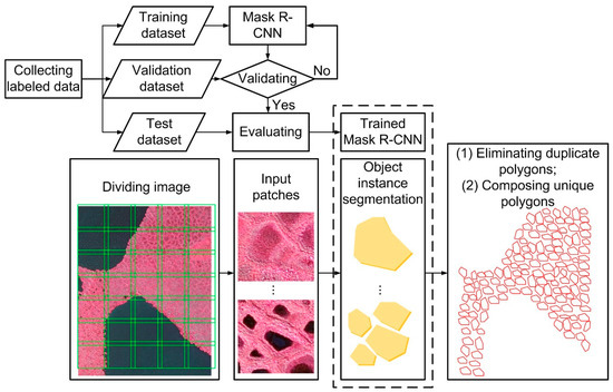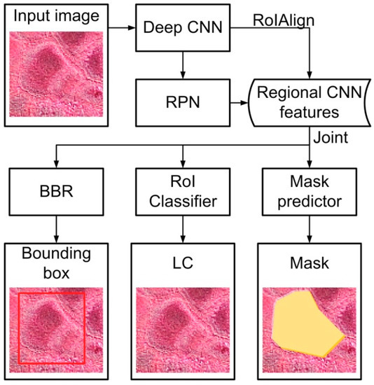 We chose the state-of-the-art Mask R-CNN method [86] to implement the object instance segmentation due to its simplicity and effectiveness [94]. The Mask R-CNN method is an extended method for object instance segmentation and is built on the Faster R-CNN (a fast and effective algorithm for object detection [95]) by including a function for predicting masks for distinct objects [86]. Methodologically, the Mask R-CNN is a two-stage algorithm: (1) the Mask R-CNN generates proposals (i.e., candidate object bounding boxes) after scanning the image; (2) the Mask R-CNN predicts the class, bounding box, and binary mask for each region of interest (RoI) [86]. In terms of structure (Figure 4), the Mask R-CNN mainly consists of (1) backbone architecture Residual Learning network (ResNet) [96] for feature extraction; (2) Feature Pyramid Network (FPN) [97] for improving representation of objects at multiple scales; (3) Region Proposal Network (RPN) for generating RoI; (4) RoI Classifier for class prediction of each RoI; (5) Bounding Box Regressor (BBR) for refining RoI; (6) FCN [98] with RoIAlign [86] and bilinear interpolation for predicting pixel-accurate mask. A deeper discussion on the Mask R-CNN algorithm is beyond the scope of this study; thus, we refer readers to He et al. [86] for a detailed discussion on the mathematical basis of the algorithm.