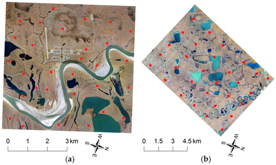 The thirty validation sites (red dots) selected from Nuiqsut (a) and Crea Creek (b) image scenes.