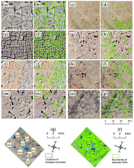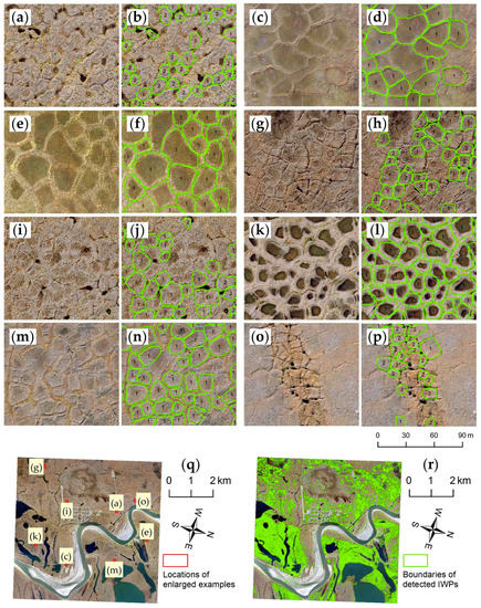 Example delineation and classification results using the 0.15 m Nuiqsut image. (b,d,f,h,j,l,n,p): detected, delineated, and classified IWPs by the Mask R-CNN where the IWP type (low- or high-centered) is given a number 1 (LCP) or 2 (HCP) in the polygon center; (a,c,e,g,i,k,m,o): corresponding portions of enlarged VHSR Imagery for Nuiqsut as visual references; (q): their locations in the study area; and (r) geographical distribution of all detected, delineated, and classified IWPs including both LCP and HCPs.