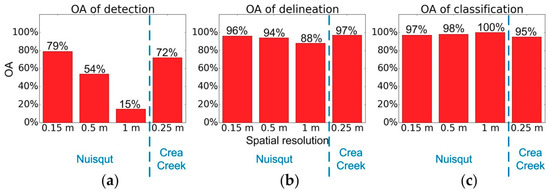 Summary of overall accuracies for detection (a), delineation (b), and classification (c) for Nuisqut and Crea Creek.