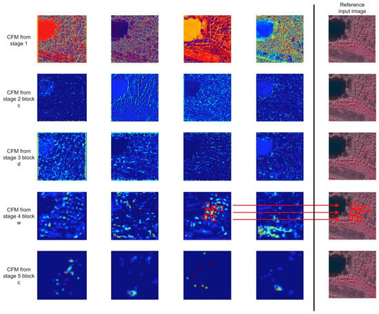 The advent of CNN has led to breakthroughs in image processing [79]. Similarly to other DL applications in computer vision, the backbone architecture of the Mask R-CNN relies on convolutional feature map (CFM) from CNN. A CFM is the output layer using a given filter (also known as kernel) to the previous layer. During the process of computing CFMs, sliding-window operations translate current window-size pixel information to a stack of the same number of CFMs by computing and generating the dot product (Figure 13 and Figure 14) with an optimized number of selected filters (such as horizontal/vertical filters, sum/average pooling etc.). The ResNet-101 of the used Mask R-CNN has five stages (a stage is used to name a layer in the ResNet depending on its position in the network): c1, c2, c3, c4, and c5. Figure 13 depicts four CFMs from each of the last output layers of the Mask R-CNN stage from 1 to 5 for HCPs. Each stage in the ResNet consists of a certain number of residual blocks, and each residual block has three layers. For example, Figure 14 (4th row) presents four feature maps from the last layer of the w block (i.e., 23th) in the 4th stage. A 101-layer ResNet includes 23 residual blocks in its 4th stage. Through the proper use of CFMs, the Mask R-CNN can detect the locations of HCPs (Figure 13 (4th row)) and LCPs (Figure 14 (4th row)) based on the high-level features, which then allows delineation and classification of HCPs and LCPs using other representative features from CFMs.