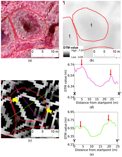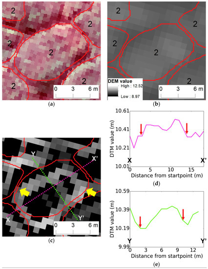 Qualitative assessments of HCP extent derived from automated optical imagery mapping (red lines and arrows) to LiDAR data. (a) False color composite of VHSR image in 1 m resolution; (b) LiDAR-derived DTM at 1 m resolution; (c) Canny edge raster from LiDAR DTM; and terrain profiles of LiDAR derived XX” (d) and YY’ (e). The number “2” inside each polygon represent an automated classification as a HCP. The yellow arrows indicate the degree of agreement between automatic delineation and Canny edge.