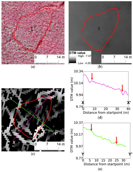 Qualitative assessments of LCP extent derived from automated optical imagery mapping (red lines and arrows) to LiDAR data. (a) False color composite of VHSR image in 1 m resolution; (b) LiDAR-derived DTM at 1 m resolution; (c) Canny edge raster from LiDAR DTM; terrain profile of XX” (d) and YY’ (e). The number “1” inside each polygon represent an automated classification as a LCP. The yellow arrows indicate the degree of agreement between automatic delineation and Canny edge.