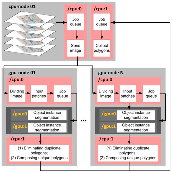 The efficient use of GPUs is essential for the success of the CNN [79]. Conducting pan-Arctic scale characterization ice-wedge polygons from commercial satellite imagery demands a computationally scalable and efficient solution. Here, the performance of I/O and the Mask R-CNN prediction must be optimized and the image data streamed directly from the data repositories to computing clusters in order to minimize the I/O bound issue. Strategies such as the Message Passing Interface (MPI, a distributed memory parallel model) may allow the implementation of the Mask R-CNN predictions on a large number of available GPUs (Figure 18). A master node would control data flow, such as images distribution and result collection using job queue. Each GPU-node would then receive an assigned image and execute prediction process across the whole image and return the final result in the master node.