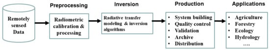 During the past forty years, since the first book with a title mentioning quantitative and remote sensing was published [1], quantitative land remote sensing has advanced dramatically, and numerous books have been published since then [2,3,4,5,6] although some of them did not use quantitative land remote sensing in their titles. Quantitative land remote sensing has not been explicitly defined in the literature, but we consider it as a sub-discipline of remote sensing including the following components (see Figure 1): radiometric preprocessing, inversion, high-level product generation, and applications. Many inversion algorithms rely on physical models of radiation regimes of landscapes, which link with remotely-sensed data. Generating high-level satellite products of land surface biophysical and biochemical variables create the key bridge between remote sensing science and applications. Conducting in situ measurements for validation of inversion algorithms and satellite products is also a critical component. Application of satellite products to address scientific and societal relevant issues will ultimately decide the future of quantitative land remote sensing.