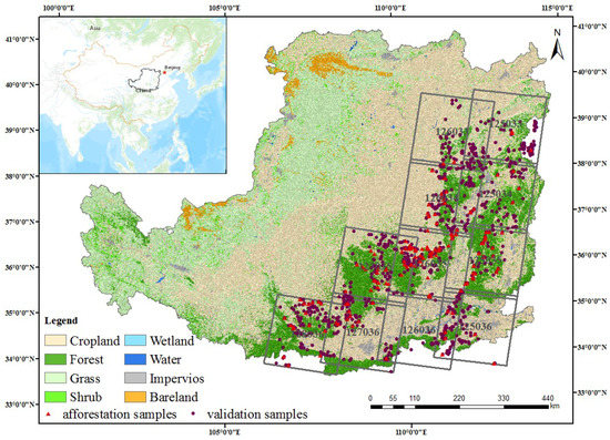 - Guo, J.; Gong, P. Forest Cover Dynamics from Landsat Time-Series Data Over Yan’an City on the Loess Plateau during the Grain for Green Project; Taylor & Francis, Inc.: Abingdon, UK, 2016; pp. 4101–4118. [Google Scholar]