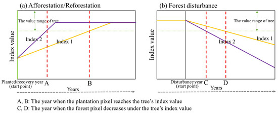 Figure 2 shows two kinds of indices. One, as in Index 2, has a fast response to vegetation change. The other, as in Index 1 has a relatively slow response and change trend. In Figure 2a, Index 2 reaches the spectral index value of tree faster than Index 1. The value range for forest will be defined in the following section. Index 2 is more sensitive to vegetation growth but saturates quickly. By contrast, Index 1 has a more gradual pattern and takes longer to reach saturation. It can provide a longer period of information on the sapling growth process and matches more closely to the length of the plantation growth. Thus, Index 1 is more suitable for describing sapling growth. In other words, the ideal index for sapling growth monitoring is the one that takes longer to saturate with a slower change trend and longer time from the planting year to the year when the sapling meets the spectral index value of tree.