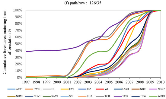 The results were consistent among the eleven Landsat scenes. Under the same amount of afforestation, the SWIR1 and Tasseled Cap Brightness (TCB) indices show that the cumulative percentage of forest area maturing from the same afforestation reaches 100% earlier and is relatively higher at each year than the remaining indices. This means these two indices took the shortest time to detect the afforestation pixels as forest. The Wetness Brightness Difference Index (WBDI) is in the second tier. Soil Adjusted Vegetation Index (SAVI), Normalized Difference Vegetation Index (NDVI), Tasseled-Cap Angle (TCA), Atmospherically Resistant Vegetation Index (ARVI), Normalized Burned ratio(NBR), Normalized Burned ratio2 (NBR2), and Disturbance Index(DI) are quite similar. They hold the lowest cumulative percentage in every year and the longest time for all the afforestation.