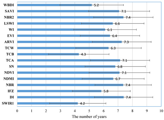 The results of Figure 4 are quite similar to Figure 3. TCB and SWIR1 are similar and they took the shortest time to identify afforestation as forest. They both showed great sensitivity to green vegetation. They are in accordance with the characteristics of the best index for detecting the actual afforestation area. As mentioned above, due to the incomplete compensation policy and development requirement of local governments, some afforestation areas have been converted back to their former land use types or converted to construction land. The shorter than 5-year capability of the SWIR1 and TCB indices to identify afforestation allows for prompt detection of over-reporting and destruction of afforestation. Furthermore, TCB and SWIR1 may be helpful for forest disturbance monitoring, especially in cases of disease, infestation, or drought. Often these disturbances are not detected until the damage reaches a serious state. It would be better to capture the disturbance as soon as the disease or infestation first breaks out so that protective action can be taken in time and damage can be minimized. Additionally, these indices can be helpful for illegal forest thinning.
