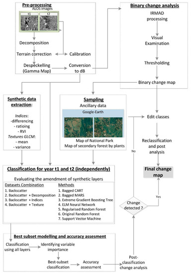 Figure 2 describes the workflow of this research. Prior to change detection, all images were calibrated, terrain corrected, de-speckled, and converted to dB (sigma0). Single Look Complex (SLC) of ALOS PALSAR were internally calibrated by JAXA prior distribution. SLC format was used to derive polarimetric decomposition features from the Cloude–Pottier theorem. Further calibration of SLC was performed based on Shimada et al. [84] to convert a complex number into a conventionally-used sigma nought (sigma0) in decibels from the SLC data. Terrain correction was assisted with SRTM-DEM 1 arc second and resampled with bi-linear interpolation to result in spatial resolution at 30 m [85]. Image speckles were filtered by using Gamma Map with a window size 5x5 following Reference [86]. Gamma Map filtering was known as simple yet time-efficient [11].