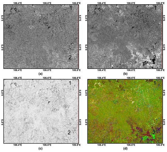 The result of IRMAD processing, i.e., (a) MAD variate-1, (b) MAD variate-2, (c) Chi-square layer, and (d) RGB of those three layers. Letters 1 and 2 were located at areas with different visual change indication.