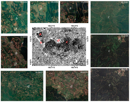A qualitative assessment through visual checking was further performed guided by the indication of change as presented in the figure. The visual check was done to validate the indication from the analysis. The visual check was made using Google Earth in the proximate date (see example in Figure 5), which guided the interpretation of different tones indicated in the binary change maps of differencing cross-polarisation data or filtered MAD variate-2 of IRMAD processing. As indicated by selected features (see a, b, c, d on Figure 5), there was a change in the sample areas. A dark tone indicated a denser vegetation from 2007 to 2010, while a light tone signified the inverse condition. A darker tone indicated a change from fields prepared for cultivation to land fully-covered with oil palm (a) or from juvenile to maturing oil palm plantation (c). The light tone signified the inverse condition from vegetated crop areas to semi-bare ones as indicated in (b) and (d).
