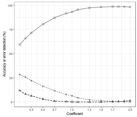 The overall accuracy, false detection and missed detection of MAD variate-2 derived from an Iteratively Reweighted Multivariate Alteration Detection for consecutive multiplier constants of standard deviation between 0.1 and 2.0 to determine threshold for change detection.