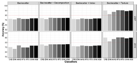 Figure 7 shows the response of classifiers in accuracy generation to the amendment of synthetic layers. Two observations, year 2007 and 2010, portrayed comparable descriptions of the response. It seems that amending dual polarization backscatter with indices did not yield a significant improvement to the accuracy, while some of the classifiers responded slightly to the amendment of the entropy-alpha decomposition. Some classifiers generated a slightly lower accuracy (−0.5%) by index amendment compared to the standard data, including MAB, SVM and CAB. Meanwhile, texture amendment substantially increased the accuracy by 20% in two classifiers, i.e., RFO, RFG, while two others CAB and XGB improved it by about 15% and 16%, respectively. SVM followed with MAB generated slightly lower improvement with texture amendment by around 13% and 10%, respectively. Extreme Learning Neural Network yielded the least accurate results by 7% with texture amendment. In general, texture amendment substantially improved the accuracy of classification and produced the highest increase to the accuracy of classification, up to 20%.