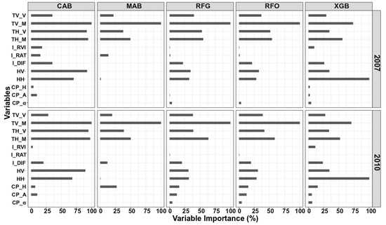 Variable importance derived from five classifiers including CAB and MAB, RFO, RFG, and XGB of 2007 and 2010 datasets.