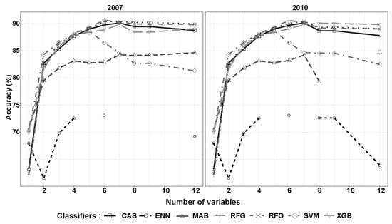 In general, tree-based classifiers including RFO, RFG, CAB and XGB generated a greater accuracy than SVM and ENN. The table demonstrates that RFG and RFO were superior compared to other classifiers by producing accuracy at about 90% for the years 2007 and 2010. The map of classification generated from the best subset model using RFG was then employed for the years 2007 and 2010.