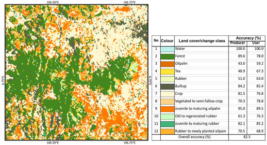 Post classification detection employing the best model could not identify the change indicated in IRMAD, and thus, the subtle change was hidden. Reclassifying images by combining important variables employing the best method for data pairs and adding more classes related to subtle change were performed for 12 classes. Five more classes were added to integrate types of subtle changes as identified in IRMAD. The additional classes included previously vegetated crop areas to semi-fallow crop areas, juvenile to maturing oil palm, old to regenerated rubber plantation, juvenile to maturing rubber, and previously rubber to newly planted oil palm. The reclassification resulted in an accuracy of about 82%.