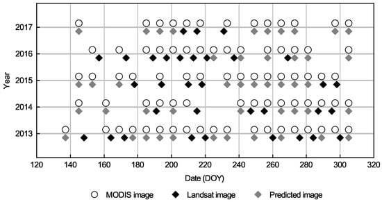 Scene acquisition dates by year for the Landsat, MODIS, and enhanced spatial and temporal adaptive reflectance fusion model (ESTARFM)-predicted images.