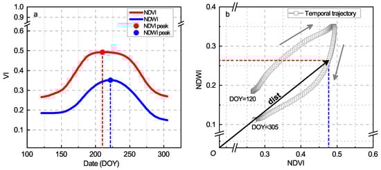 Schematics showing (a) the normalized difference vegetation index (NDVI) and normalized difference water index (NDWI) time series in date-VI form and (b) the calculation of  (the distance from the pixel to the origin in the phase–space) in the corresponding NDVI–NDWI phase–space for an example rice pixel.