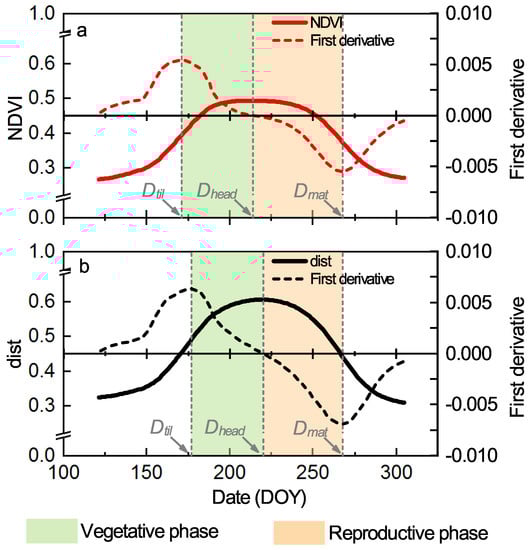 The active tillering date (), middle heading date (), and maturity date () were first defined for the NDVI time series: The date of the maximum point on the first derivative was used to estimate ; the date of the maximum point was used to estimate ; and the date of the minimum point on the first derivative was used to estimate  (Figure 4a) [,,]. Then, we applied these existing phenological extraction methods to the phase–space. Specifically, the phenometrics were redefined based on the time series of dist:  was redefined as the date of the maximum point on the first derivative of ;  was redefined as the date of the maximum value of  and  was redefined as the date of the minimum point on the first derivative of  (Figure 4b).