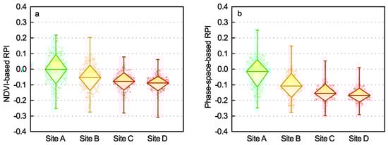Statistical box charts of (a) the NDVI-based RPI and (b) the phase–space-based RPI in the four experimental sites. Central lines represent the medians, boxes represent mean ± standard deviation, and the whiskers represent the minimum and maximum values.