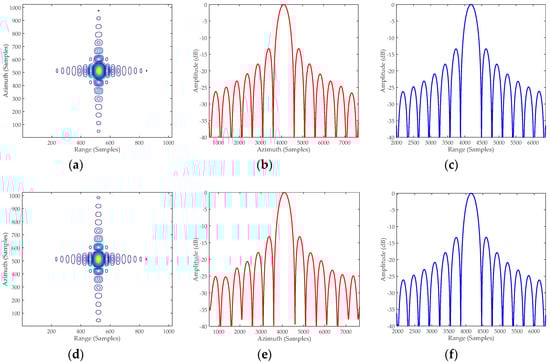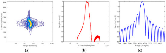 Position D has the largest ground squint angle, which should be simulated to verify the performance of proposed imaging algorithm. Since the performance comparison with the start-of-art algorithm has been presented in position A above, only the results of the proposed algorithm are shown here, in Figure 18 and Table 4. The simulation parameters are listed in Table 1 and Table 2, and the simulation layout is the same as shown in Figure 15.