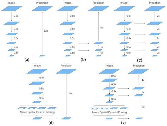 Alternative network structures in dense semantic labeling (a) The classic FCN-32s, (b) The classic FCN-8s (with skip architecture), (c) Encoder-Decoder, (d) Atrous Spatial Pyramid Pooling and (e) Ours.