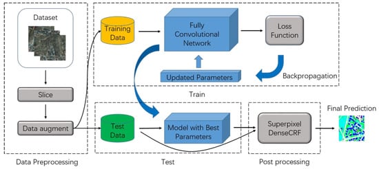 The pipeline of our dense semantic labeling system, including data preprocessing, network training, testing and post-processing.
